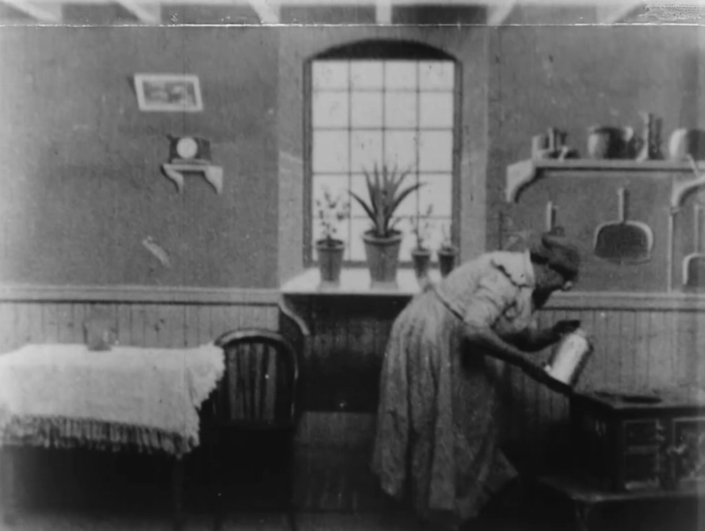The picture also feels modern in its editing and closeups. Even dedicated viewers of early film become accustomed to polite, show-the-whole-actor cinematography and Smith cuts between wider shots of the kitchen and closer shots of Mary Jane as she plays with soot and fills the stove with paraffin. There are also wipes between scenes, another technique we tend to associate with later movies. In short, this was all cutting edge stuff in 1903 and it still looks good.