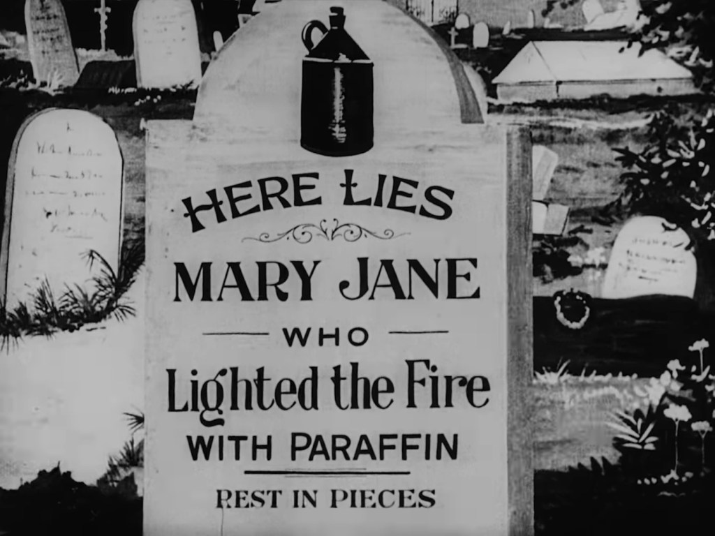 Smith knew what he liked and he featured even more of it in his innovative 1903 comedy Mary Jane’s Mishap. Mary Jane (Bayley) is a goofy domestic who wakes up late, gives herself a soot mustache while shining shoes, and then tries to light the stove. Oh fiddlesticks, it’s not lighting and she’s late! To speed things up, she tips in some paraffin from a clearly-labeled can. Then, she kneels down to light the stove and, well, bye-bye Mary Jane.