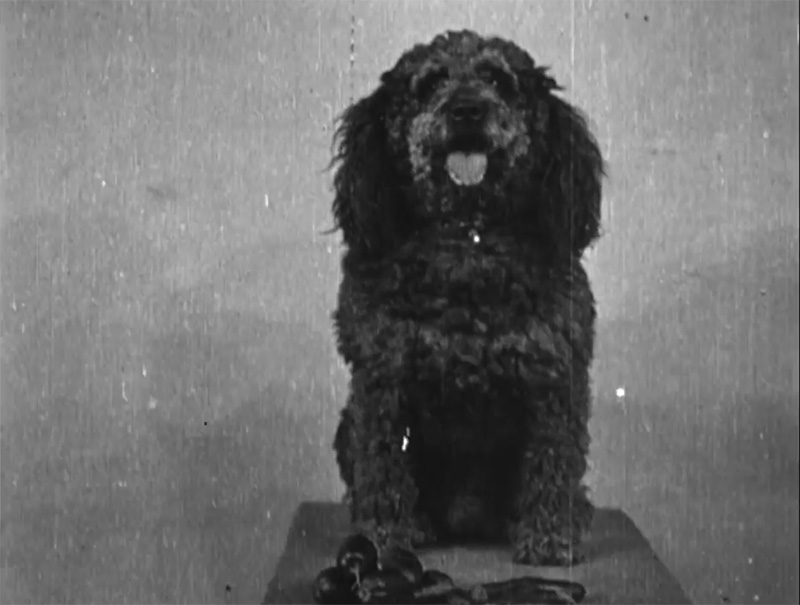 No time is wasted at the beginning of the picture. There is an opening shot of our small hero, a fluffy poodle, and then we cut to the front of a butcher shop with a coil of sausages resting on display outside. The poodle wanders into the shot, looks around to see if the coast is clear, grabs the sausage link at the end of the string, and then hightails it for parts unknown with twenty feet of sausages trailing behind.