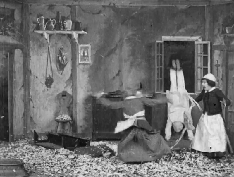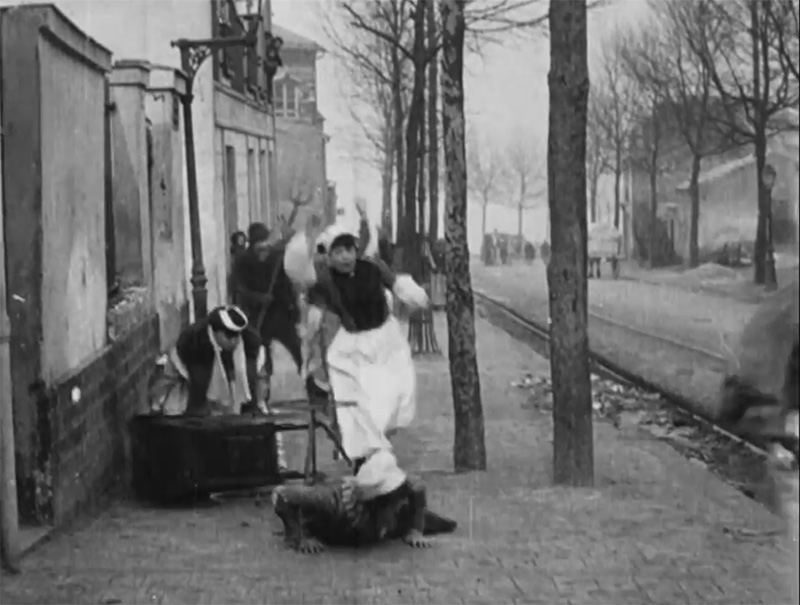 Guy goes for both variety and quantity in her chase picture, with every form of obstacle thrown in front of poodle and pursuers. There’s no fruit cart (that was pioneered by Méliès in his 1904/1905 picture An Adventurous Automobile Trip) but we do get a crockery cart being smashed, plus exploding pillows, so we cannot accuse Guy of shorting us.