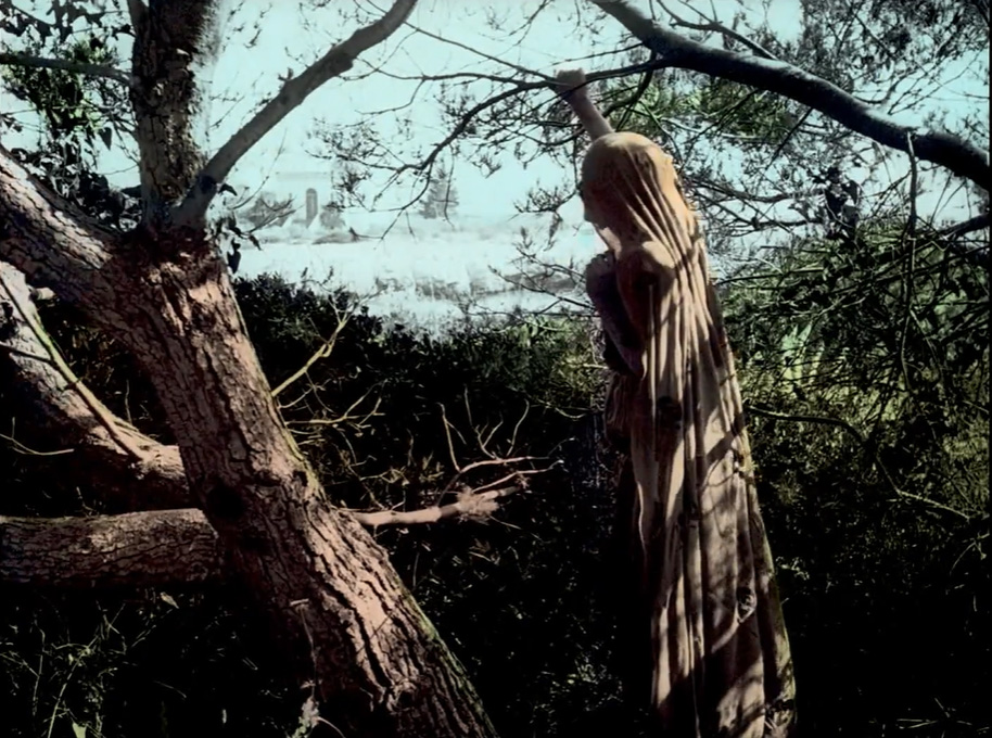 However, the main attraction here is the color. Stencil color was introduced in the 1900s and it is exactly what it says on the tin: thousands of tiny stencils were cut, one for each color of each frame, and the color was then stamped onto the movie’s prints. Natural color technology was fussy and did not capture the full spectrum, so stencil color remained popular even after newer technology was introduced, particularly in France, where most of the stencil color laboratories and technicians could be found.
