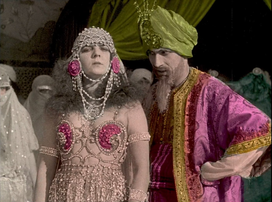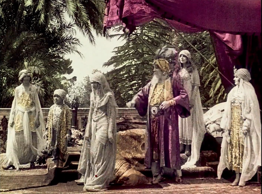 In the aftermath of the First World War, France was ready to reassert its position as a global cinema powerhouse and productions of the late-1910s through the 1920s grew bigger, grander, more elaborate… and more colorful. The Sultana of Love has an official release date of 1919 but the 1923 release is the one we will be focusing on because it was a showcase for one of France’s most famous movie crafts: applied color.