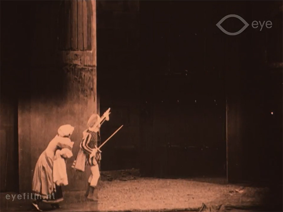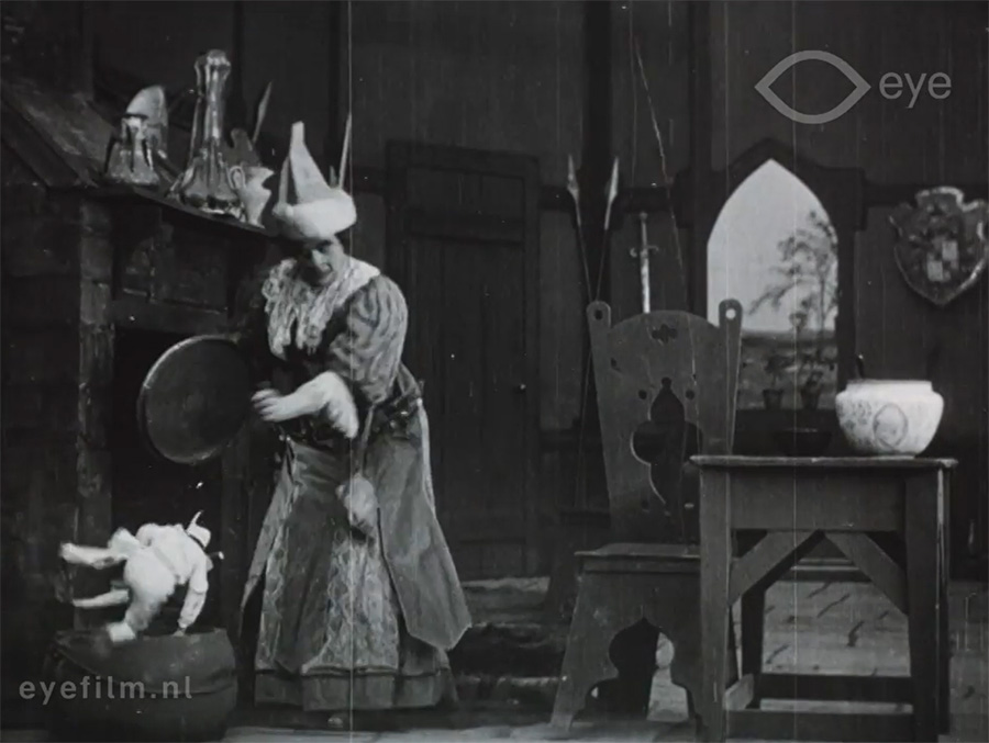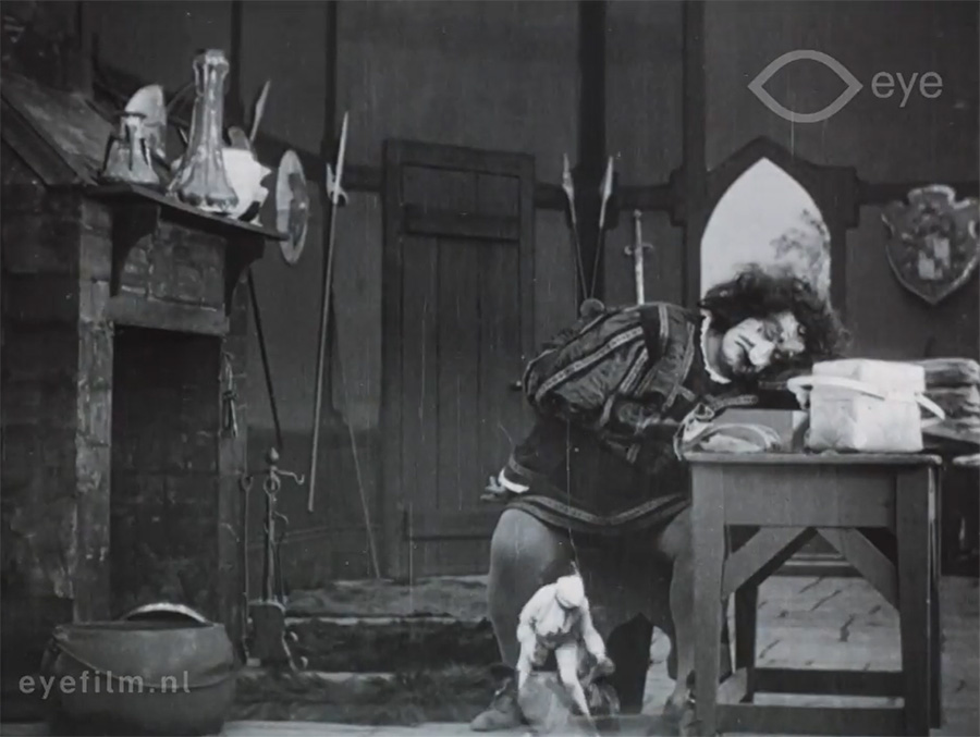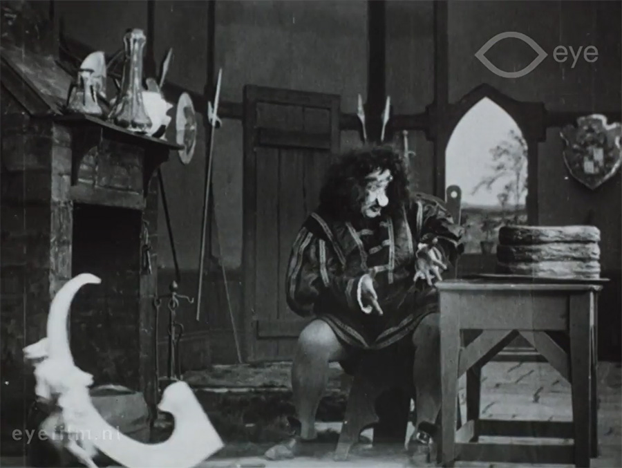 The special effects are remarkably smooth and clever. It appears that the giant and his wife were filmed on full-size sets, while Hulette and the props she was to steal were shot on a carefully-matched black background in double exposure. Hulette was dressed in white or pale blue and the props were similarly light, which meant they stood out against the dark background of the giant’s castle set and appeared solid rather than transparent, as is usually the case with double exposure. There are a few cases where the illusion breaks: you can see that darker shadows, the folds of Hulettes trousers or the stripes of the bag, for example, become see-through but generally, the illusion is excellent.