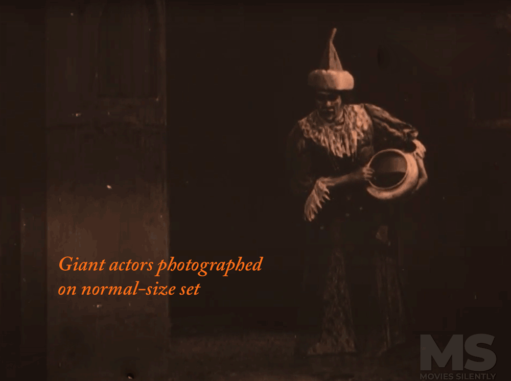 Dawley’s team was particularly clever about the props. The giant’s basket, for example, was made twice: a normal-size prop for the giant and a larger version for Jack to steal. The giant lowers the basket to the floor and Dawley uses a substitution splice, removing the basket from the giant shot and adding it to the Jack shot. Again, carefully matched on two different sets with some minor jumps and jitters but impressive overall. As the trade magazine Moving Picture World puts it, “It is a trick picture of course; but there is very little in the scenes to suggest that the relative sizes of Jack and the Giant are not as they seem to be.”