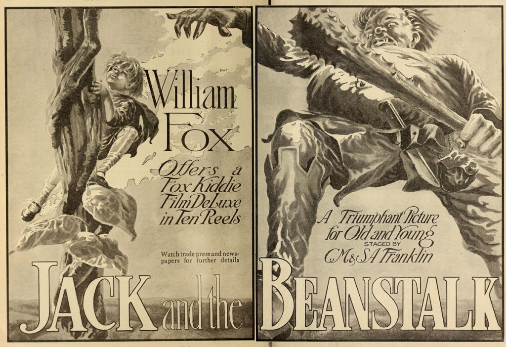 Jack’s tale was one of the favorites to film during the silent era. In addition to the Porter version, there was an all-child cast version from Thanhouser in 1913, mentions of a Kinemacolor film released around the same time, a 1917 “Fox Kiddies” all-child cast version, a Walt Disney animated version in 1922, a Baby Peggy picture in 1924, and a silhouette animation the same year. In the sound era, animators from Max Fleischer (with Betty Boop, of course) to Lotte Reiniger to Ub Iwerks to Chuck Jones and Friz Freleng both sending Bugs Bunny up the beanstalk (Jones sent Daffy Duck too for good measure.). In short, Jack was hot stuff, on par with Cinderella and Snow White in popularity.