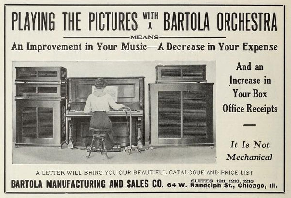 The Excelsior Sound Effects Cabinet billed itself as an all-in-one solution for adding mood and realism to moving picture shows and promised that their contraption could provide the following sounds: “Locomotive effect, foundry effect, rain, wash of waves, motor boat, pulley and hoisting, donkey bray, sewing machine, torn torn, phone bell, engine bell, sleigh bells, spurs, anvil, church organ, horse trot, china and glass crash, hail, roar of waterfall, automobile exhaust, baby cry, police rattle, slap sticks, railroad whistle, bicycle bell, door bell, tin rooter [festive noise-maker], sword clash, church chimes, telegraph, steam exhaust, wind — light and heavy, thunder, dip of oars, automobile horn, duck quack, flying machine, drum, cow moo, cow bell, patrol and fire gongs, bird whistle, fencing, steamboat whistle, closing doors, lion, elephant, tiger and bear growl combined; cannon, rifle and pistol shots — single or in volley, etc.”