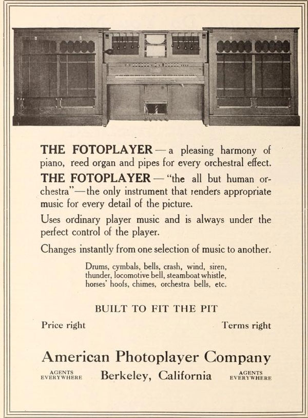 Synchronized sound effects were likewise available before recorded soundtracks became the norm. There were fancy machines like the Fotoplayer, a combination player piano and sound effects rig, but many theaters relied on the simple pairing of a pianist and a percussionist, the latter providing the effects in time to the action onscreen. (Well, that was the idea anyway. In practice, it depended on both the sobriety and attention span of the performers.)
