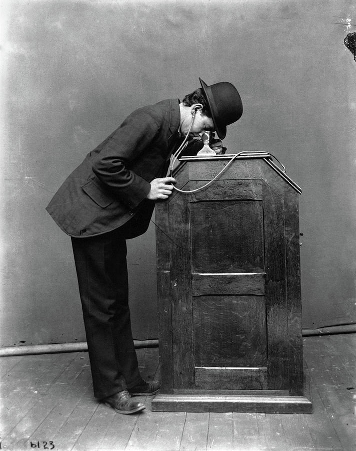 I don’t agree with this definition for numerous reasons. Most importantly, movies have been an audiovisual medium used in tandem with recorded (or at least reproduced) music from the very beginning. There is the Dickson Experimental Sound Film from 1894, of course, but on a commercial level, the Edison Kinetophone was a peepshow machine that played recorded music along with moving pictures via a contraption best described as “communal earbuds.” (Edison would later reuse the brand name for his doomed attempt to popularize talkies in 1913.)