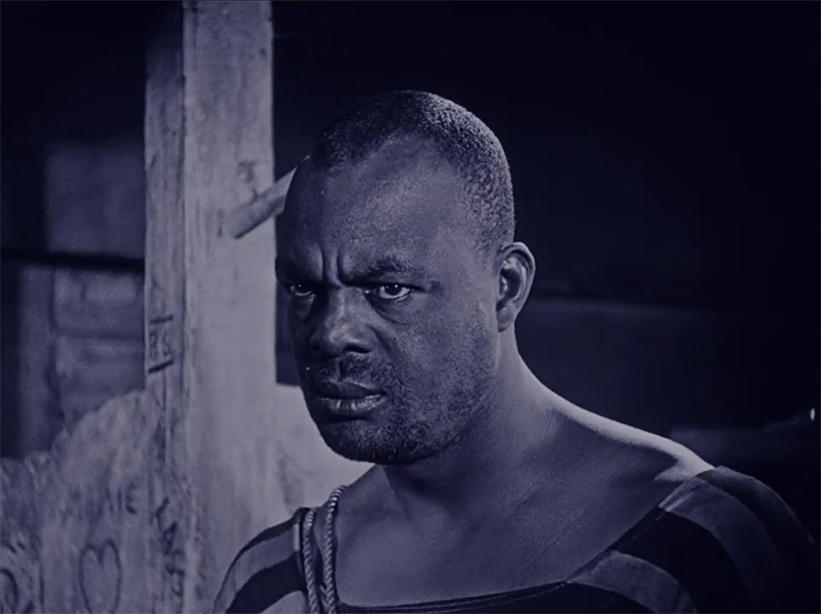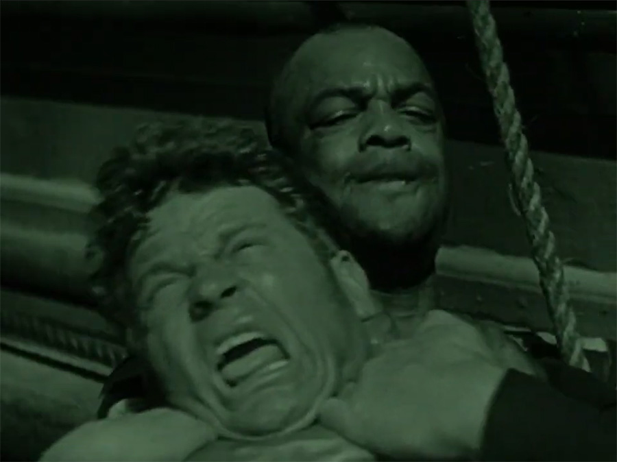 Other significant members of the new crew include Rev. Deakon (Chappell Dossett), a do-good preacher who was threatening the Knitting Swede’s business with his ministry, and a character only described as “Negro” in the credits, played by baseball star-turned-actor Blue Washington. (I’ll refer to him as Washington for the duration of the synopsis.) Washington just wanted to make his way quietly through San Francisco and not make trouble or find trouble, so he is inclined to keep his head down for the duration of the cruise. Deakon, however, is outraged and demands that Captain Swope put him back ashore. He is beaten for his trouble and the crew quickly quiets down.