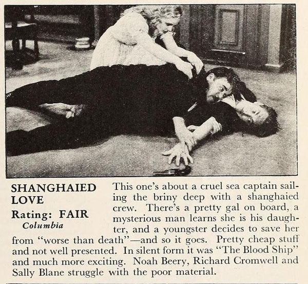 For all its splashiness, The Blood Ship had the misfortune of being released in the summer of 1927, just before The Jazz Singer would turn the movies on their head. The Blood Ship was an excellent silent movie but it didn’t have legs as long as other hits of the era because of its unfortunate release date. In fact, Columbia remade it just four years later as Shanghaied Love, directed by Seitz again and with Noah Beery, Richard Cromwell and Sally Blaine as Swope and the romantic duo, Willard Robertson in the Bosworth role and Fred “Snowflake” Toones in the Washington role, the character renamed Snowflake to match. (One step forward, two steps back.)