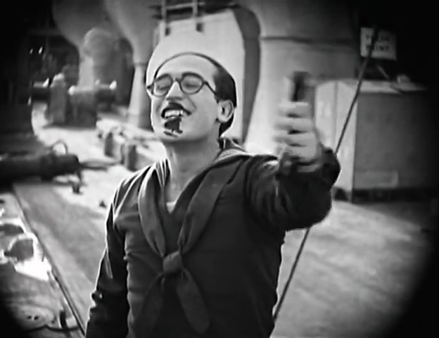 A Sailor-Made Man doesn’t have a complete story so much as a string of loosely-related incidents, like isolated shorts woven together. Again, this was typical for both Harold Lloyd films released earlier under the Hal Roach banner and later Hal Roach releases with stars like Charley Chase and Laurel and Hardy. In practical terms, it was probably a way to split a two-reeler into two one-reelers, a three-reeler cut down to a two-reeler, etc. and it was also a way to use two or more one-reeler scenarios in one go. Whatever the reason, I am so used to it, from Fluttering Hearts to A Chump at Oxford, that I don’t really see it as a flaw. (Though I do think a few scenes of Lloyd being humbled during his early enlistment wouldn’t have been amiss.)