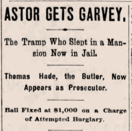 Garvey’s cases wended through the courts and he was finally declared insane on May 15,1895 and committed to Matteawan State Hospital. By this time, the story had slipped out of the public eye and the news was relegated to page 5 of the New York World. This was likely the most convenient conclusion for the Astor family and the New York justice system, as insanity removed the question of favoritism for the wealthy. Garvey was released sometime after and an 1896 item in the Savannah Morning News boasted that he was once again a tramp.