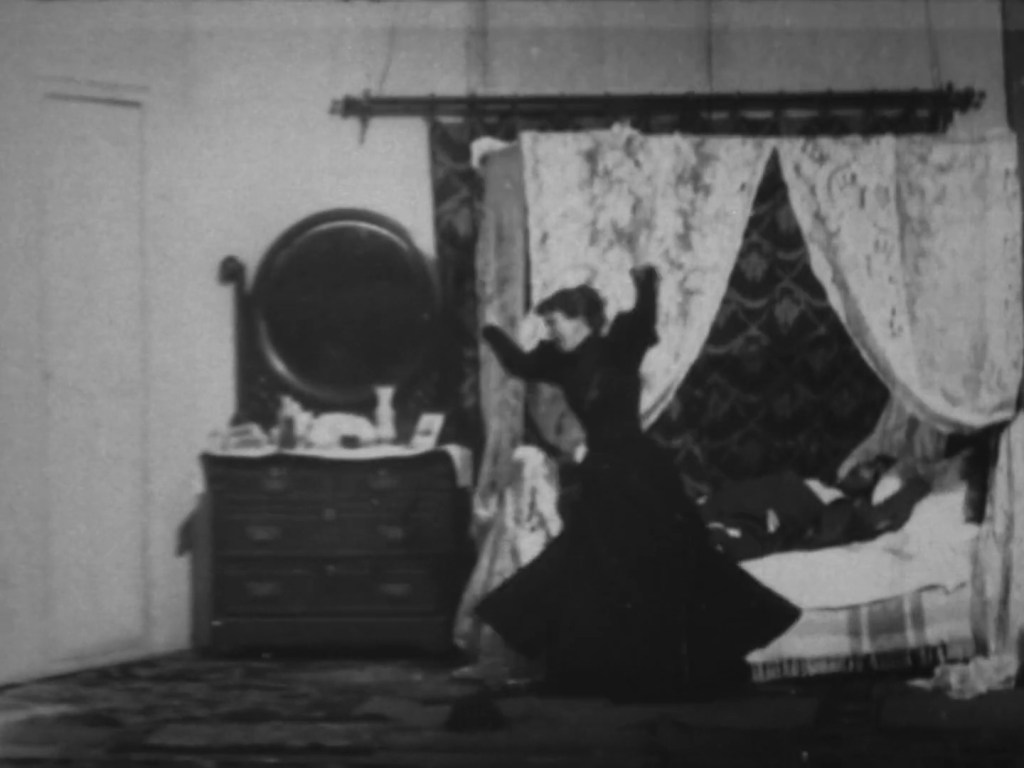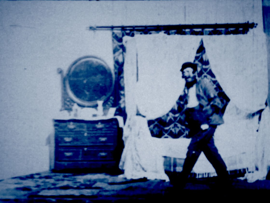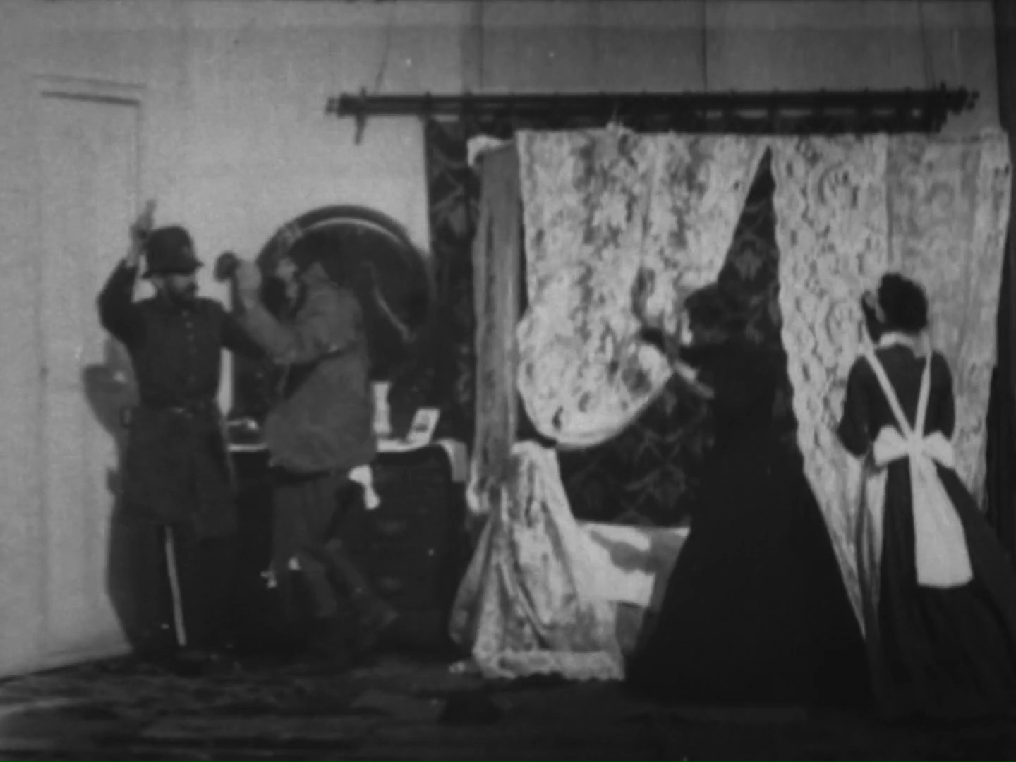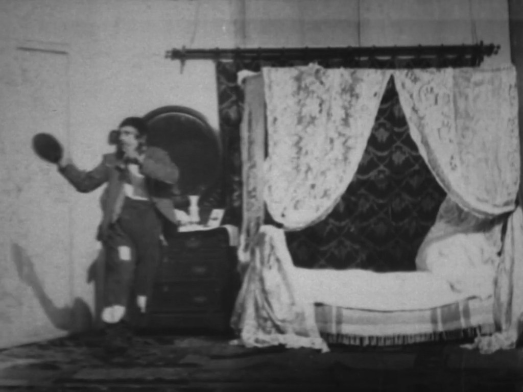 The music was likely The Tramp That Slept in Astor’s Bed (1894) by Charles B. Lowler and James W. Blake. In the film, the tramp finds his way into a bedroom and rejoices at his good fortune. He tries on some of the powders and perfumes in the vanity and then settles into the soft bed for a snooze. The lady of the house returns and does not notice him at first. When she realizes that the bed is occupied by an interloper, she flees. A maid comes to investigate and likewise runs away in terror. Finally, a policeman arrives to take the tramp away. The tramp is later shown reading about his own exploits in the newspaper and congratulating himself, kicking away the small paperboy who asks for payment.