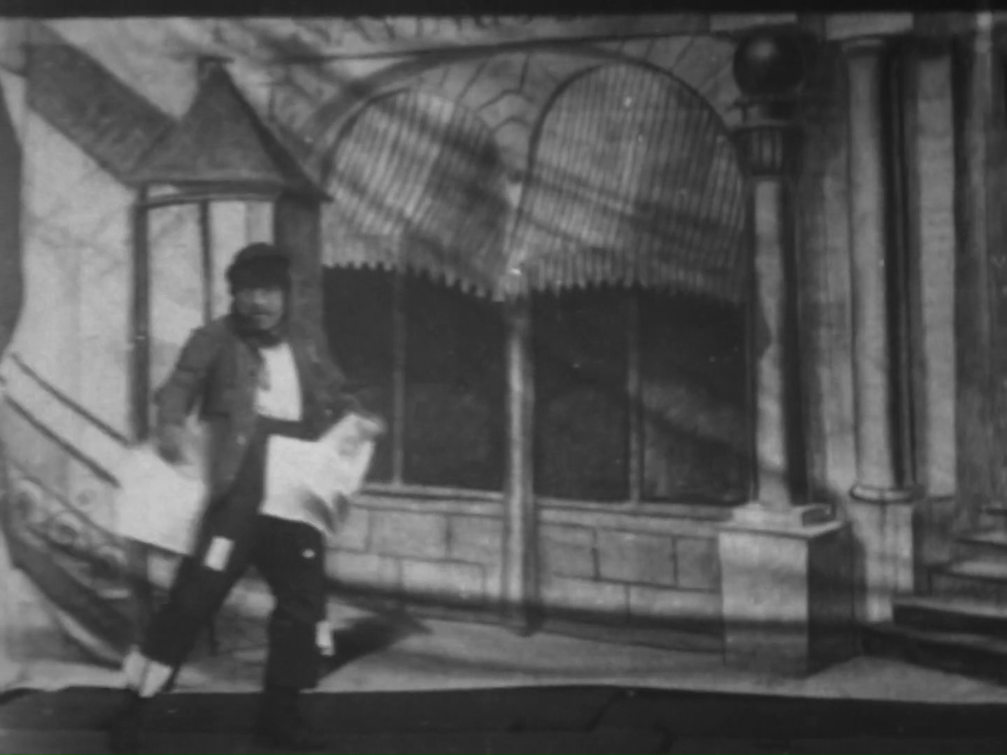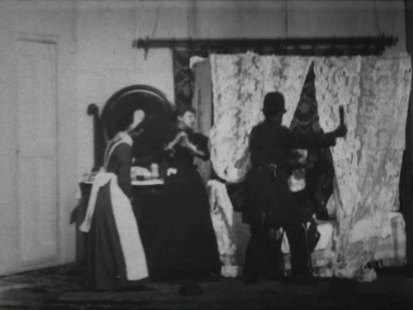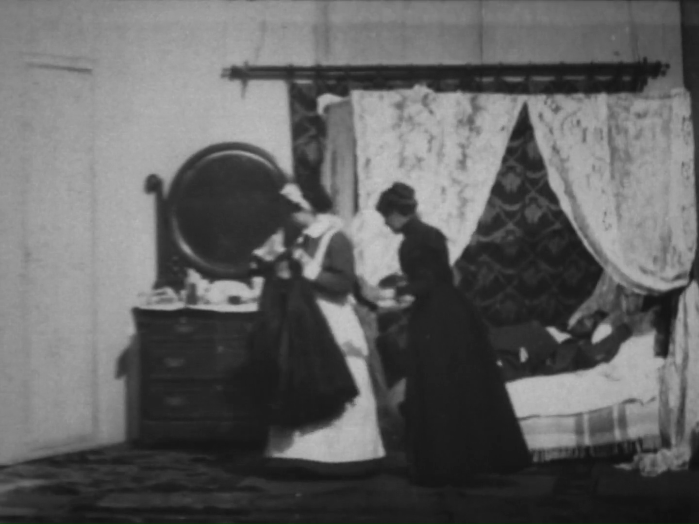 The music was likely The Tramp That Slept in Astor’s Bed (1894) by Charles B. Lowler and James W. Blake. In the film, the tramp finds his way into a bedroom and rejoices at his good fortune. He tries on some of the powders and perfumes in the vanity and then settles into the soft bed for a snooze. The lady of the house returns and does not notice him at first. When she realizes that the bed is occupied by an interloper, she flees. A maid comes to investigate and likewise runs away in terror. Finally, a policeman arrives to take the tramp away. The tramp is later shown reading about his own exploits in the newspaper and congratulating himself, kicking away the small paperboy who asks for payment.