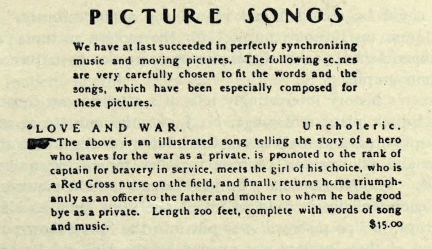Between these two Kinetophone attempts, the Edison catalog reveals further attempts to bring words to the movies, focusing on Picture Songs. Per the 1900 catalog: “We have at last succeeded in perfectly synchronizing music and moving pictures. The following scenes are very carefully chosen to fit the words and the songs, which have been especially composed for these pictures.” I have not seen the sheet music that originally went with the Picture Songs but it was likely synchronized to onscreen cues.