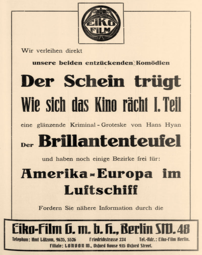 I would love to credit the actors but I can find little information about the cast or crew of the film. The Eiko company ads for the film also touted Amerika-Europa im Luftschiff, a zeppelin melodrama that I knew Universal had imported as The Sky Monster. (Carl Laemmle never lost his love for the old country.) I checked to see if Universal had taken Appearances Are Deceptive as well and they had, awkwardly retitling it Appearances Are Often Delusive.