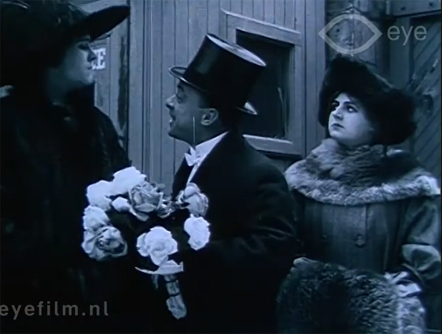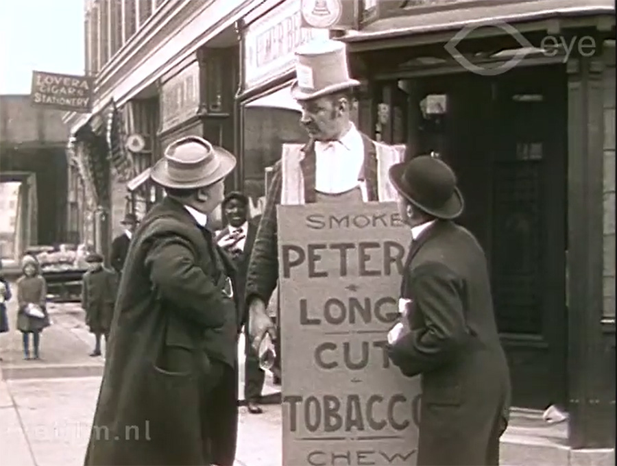 After leaving the theater, Hughie and Harry spot a sandwich man advertising “long cut tobacco” while wearing a sandwich board and handing out pamphlets. “Long cut” indeed because he is nearly seven feet tall. (The actor is not credited but trade magazines call him “the Vitagraph tall man” so let me know if you have a name.) Hughie and Harry offer him a generous sum of money to come work for them on a small project…