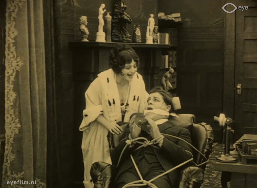Meanwhile, in the role of her husband, Harry Pollard overacts, exaggerating his character’s gestures like he’s playing charades to win. The director should really have reined him in, who directed this… Ah, Harry Pollard. But seriously, Fischer and Pollard, already married when they filmed A Joke on Jane, were something of a movie power couple and he went on to direct big budget pictures like the aforementioned Uncle Tom’s Cabin and the 1929 version of Showboat. It’s probably for the best that Pollard’s character spends most of the film trussed up and that he later switched over to directing exclusively.