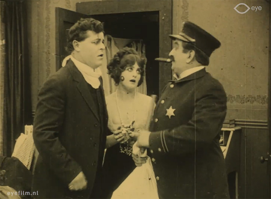 A quick note that the film contains multiple scenes of characters turning electric lights off and on. It is probable that for its original American release, the film would have included yellow or amber tints for the lights on and blue tints for the lights off. The version I saw is a Dutch release print that is tinted yellow for interiors, green for exteriors and blue for the title cards (title card tinting was a common anti-piracy measure) but the more elaborate scheme was not used. I mention this because some scenes would have played better if there had been tints to convey darkness and this is an issue with the release color scheme and not the filmmaker.
