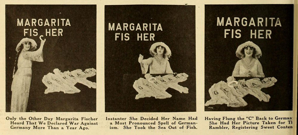 “Margarita Fischer kicked the “c” bodily out of her name last week by means of a little ceremony that indicated how much in earnest she was. She picked the offending, Germanish letter from the center of her last name and tossed it lightly onto the clay map of Germany that had been fashioned on a table for her ceremony.