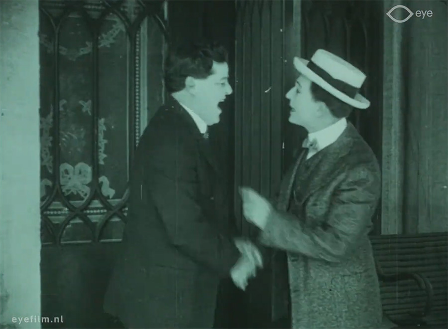 A quick note that the film contains multiple scenes of characters turning electric lights off and on. It is probable that for its original American release, the film would have included yellow or amber tints for the lights on and blue tints for the lights off. The version I saw is a Dutch release print that is tinted yellow for interiors, green for exteriors and blue for the title cards (title card tinting was a common anti-piracy measure) but the more elaborate scheme was not used. I mention this because some scenes would have played better if there had been tints to convey darkness and this is an issue with the release color scheme and not the filmmaker.