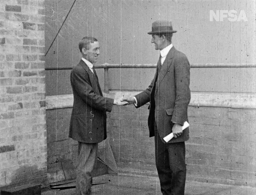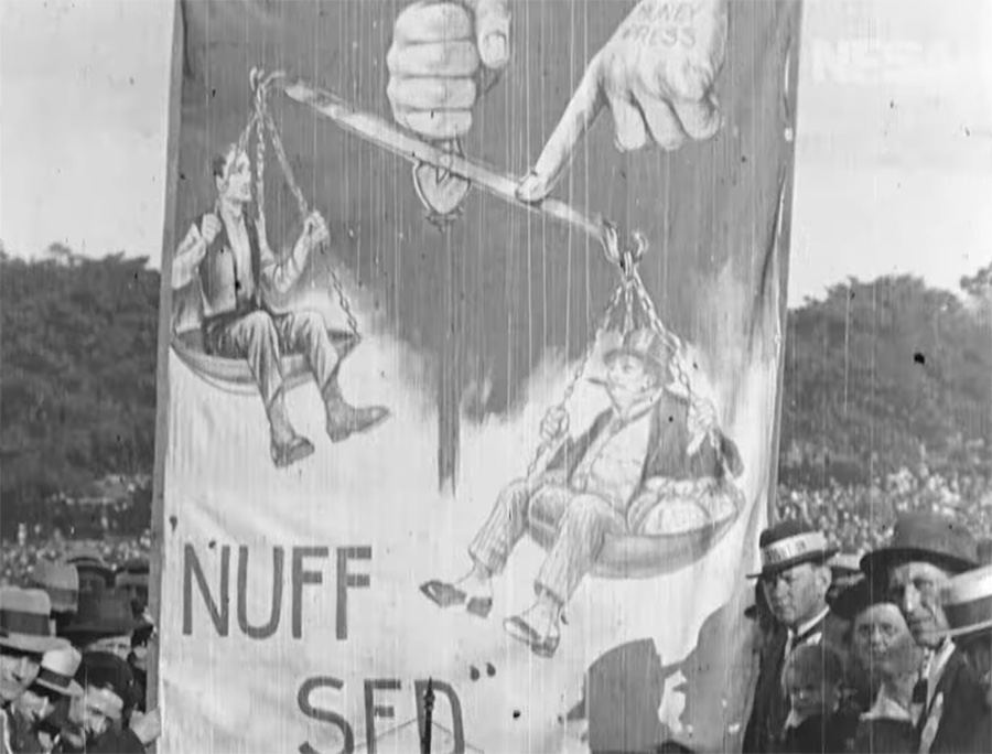 The surviving footage opens with “trouble brewing” at a labor meeting and then shots of laborers marching with signs and banners. Title cards relay the songs being sung (possibly as a cue to movie theater accompanists) and the strikers cheerfully tip their hats to the camera. These scenes take up a third of the surviving footage and convey the large crowds that turned out for the marches. And, as always, seeing normal people in everyday streetwear as opposed to studio-curated costumes is always a pleasure.