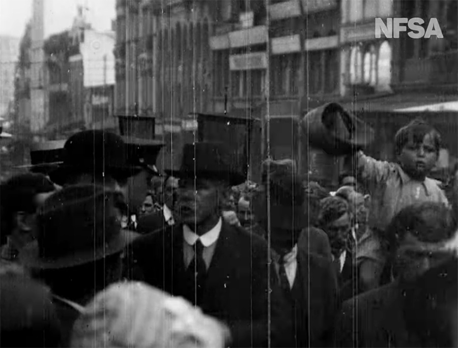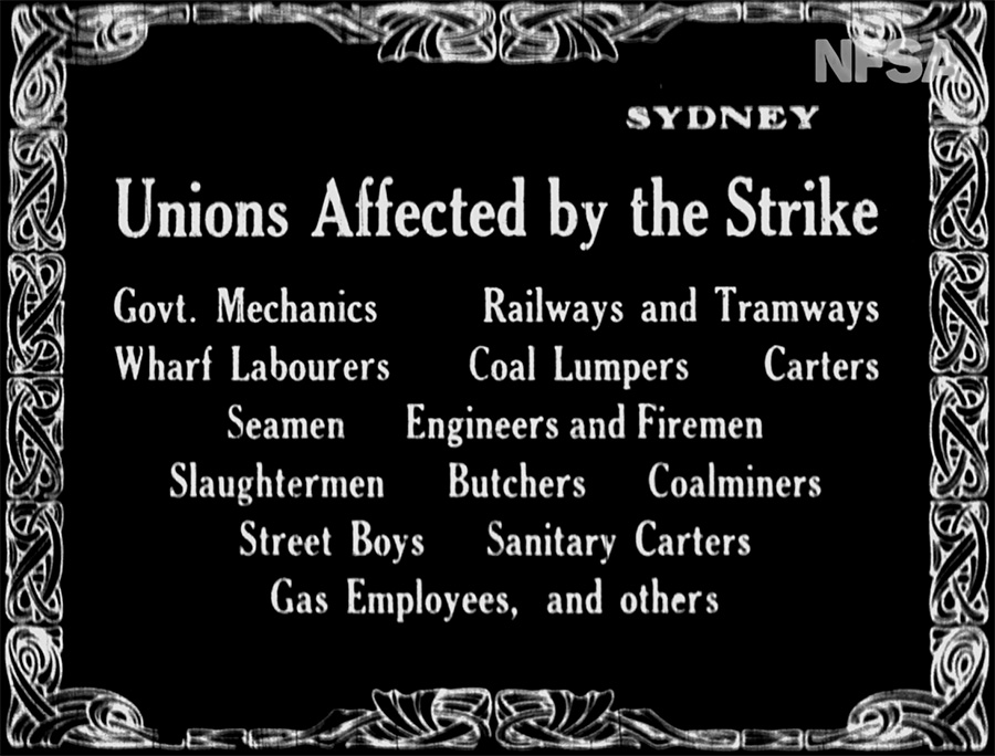 But we’re here for movies and so we won’t be heading into the deep waters of the twentieth century labor movement. As you probably guessed, Tinsdale, who had relocated to Sydney, was conveniently on hand at the epicenter of the Great Strike and no silent era filmmaker was going to let free material pass him by.