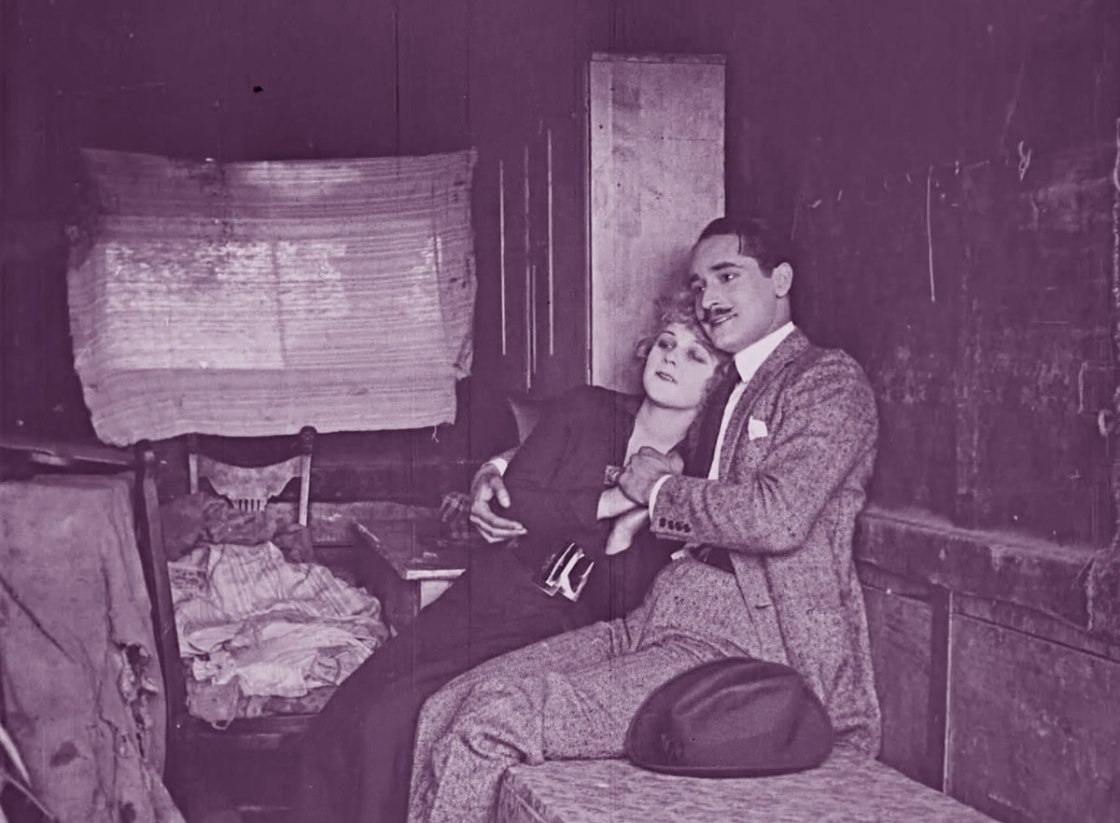 Virtuous Sinners opens with Dawn (Hawley) returning home after trudging the street looking for a job. (Per the censor evasion of the time, this would have hinted to the audience that the job was sex work.) Her husband searches her purse for money and, finding none, informs her that their marriage was a scam with a fake preacher and throws her own into the cold.