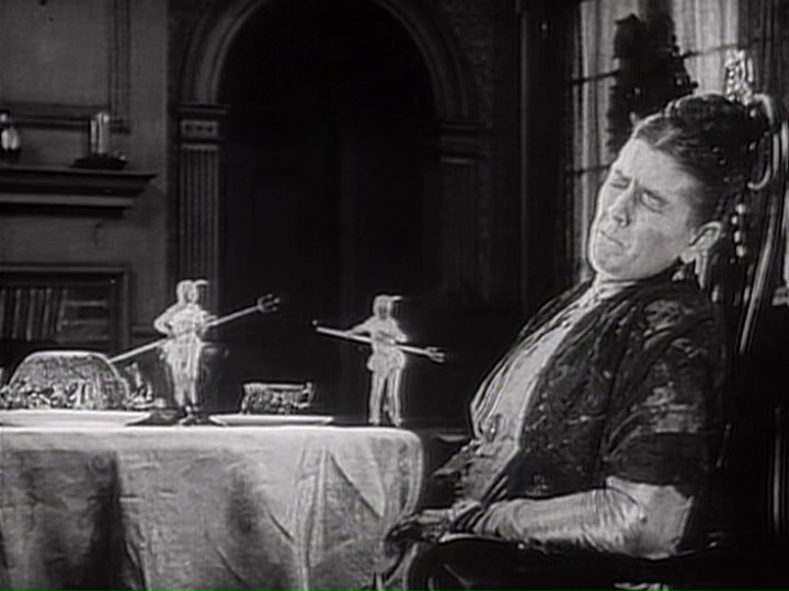 Paul Powell, who had directed Fairbanks in the frenetic comedy The Matrimaniac, leans into the comedy of the story but the film starts with a tragedy. Pollyanna (Pickford), the eleven-year-old daughter of a missionary in the Ozarks, sits at her father’s side as he dies. She is sent to live with her Aunt Polly (Katherine Griffith) in New England. Aunt Polly is a commanding woman who dislikes children and has only taken in Pollyanna out of a sense of duty. She quickly becomes irritated at the child’s uninhibited enthusiasm and optimism. Nancy (Helen Jerome Eddy), the maid, is charmed and becomes Pollyanna’s ally.